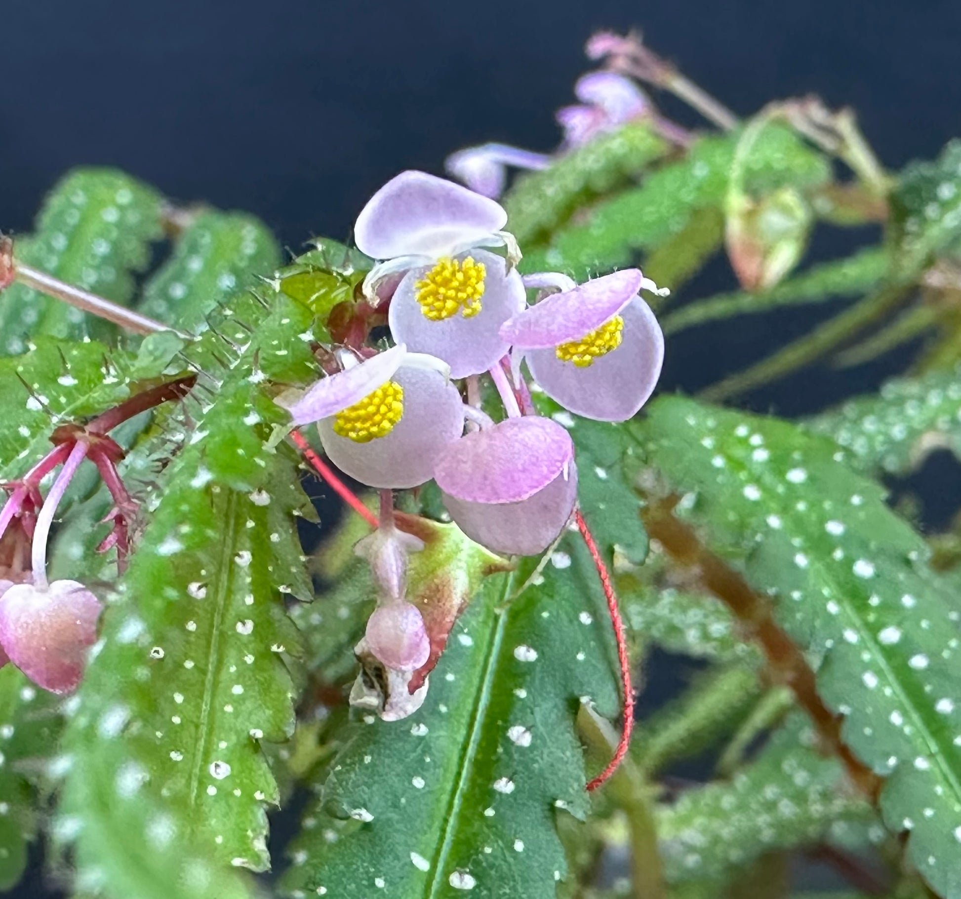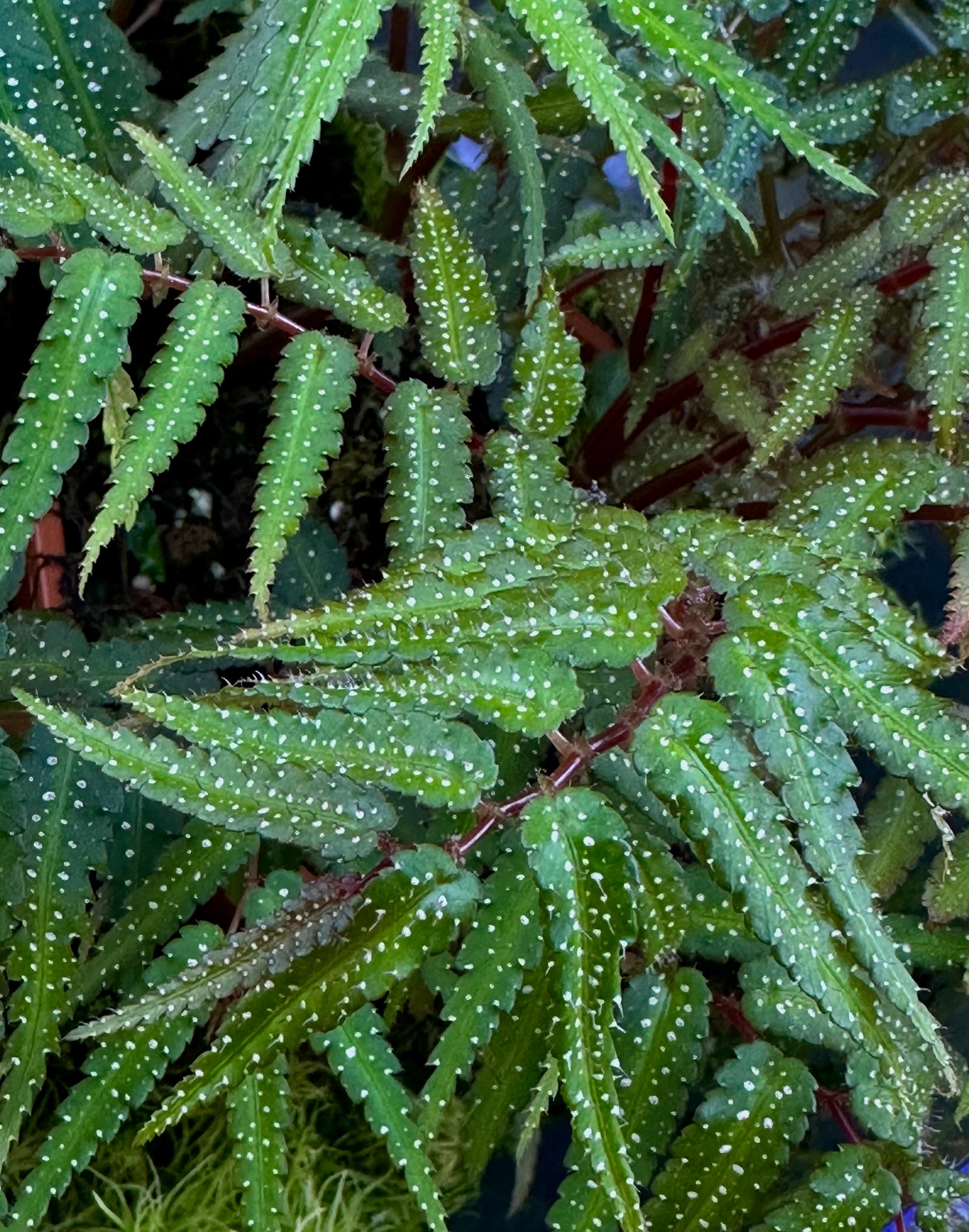 20+ seeds of this very distinctive, atypical tuberous begonia from Thailand, where it grows in the crevices of vertical limestome walls. These seeds have mixed genetics as they come from cross-polination of the plain red leaf form with the spotted, green leaf form, so both forms can be expected among resulting seedlings. Prefers terrarium conditions. Seeds of seeds of this species are very rarely available. First time offered.